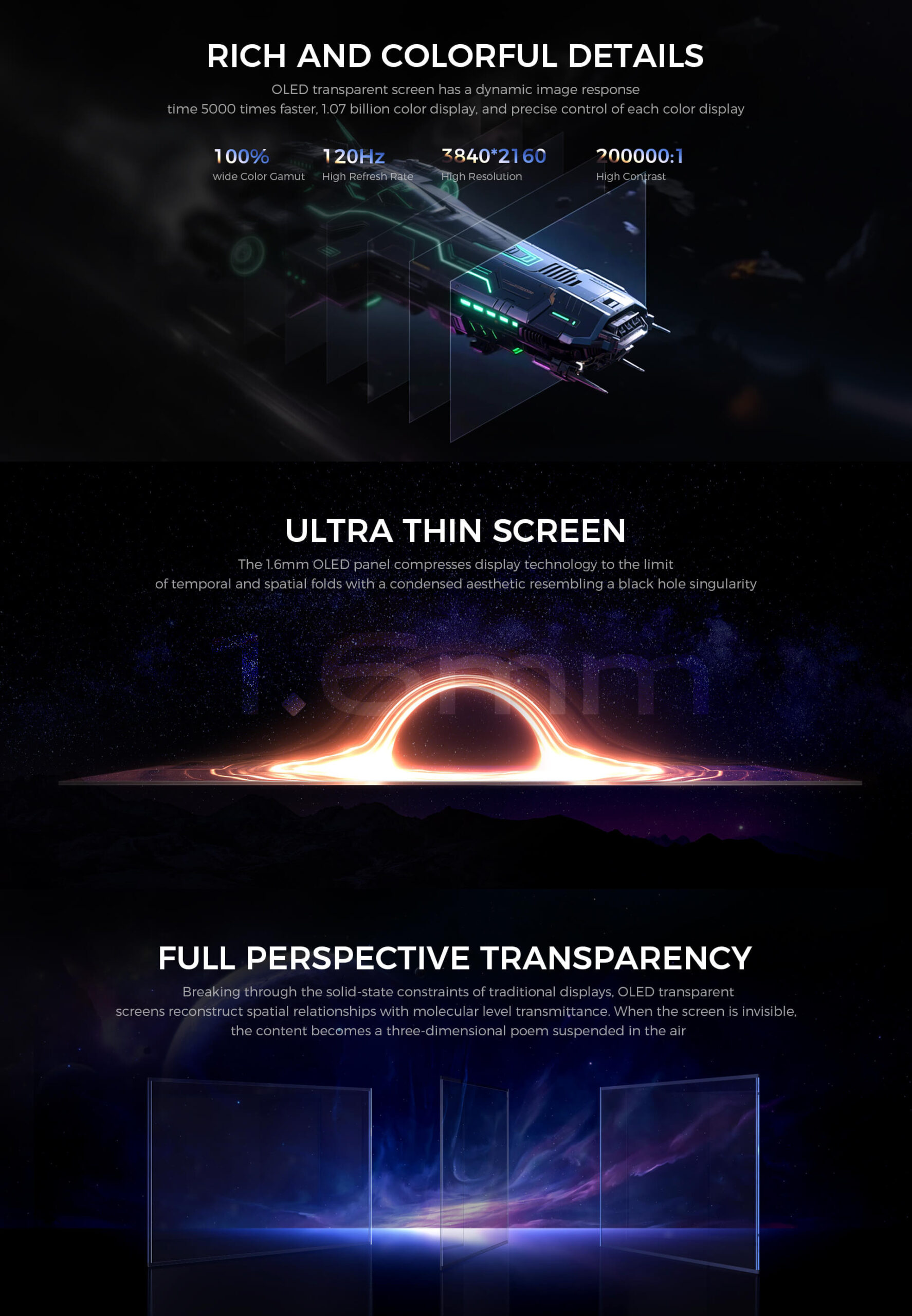 FutureXLED™️ OLED Transparent Display leverages self-emissive technology without backlight layers, achieving full transparency when powered off with exceptional contrast, vivid color reproduction, sub-1mm ultra-thin flexibility—engineered for retail showcases, automotive HUDs, and AR wearables demanding flawless see-through visibility.